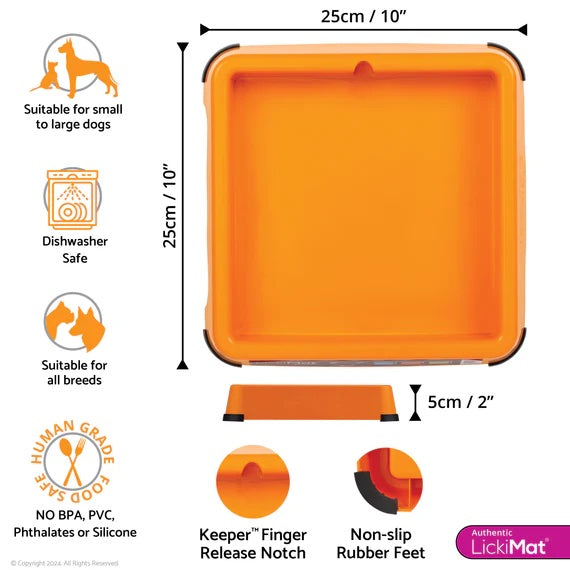Dishwasher-safe and compatible with Classic and Tuff LickiMats, this product is uniquely designed to keep your pets from munching and moving their mats. It even includes a patent-pending notch for easy removal, and can double as a feeding bowl.