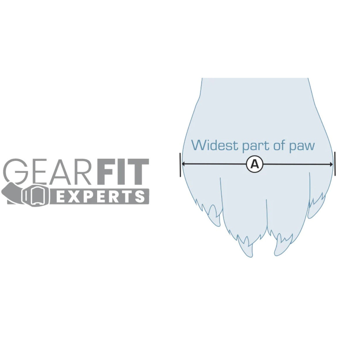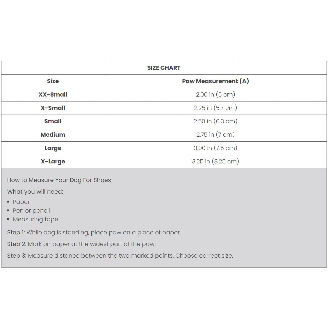• Measure for dog shoes by measuring the widest part of your dog's paw when they are standing and compare it to the size chart below