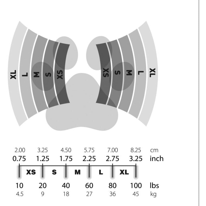 Sizing: Measure the front paw by having your dog stand on a piece of paper. Lift the opposite paw and mark the widest points of the paw pad on the paper. measure the distance between the marks and compare to the chart below.