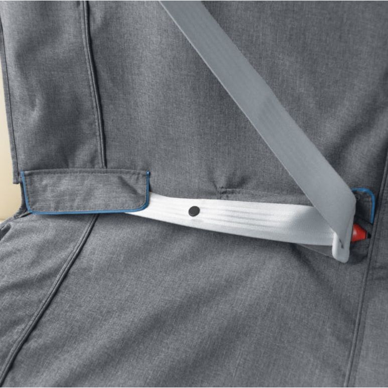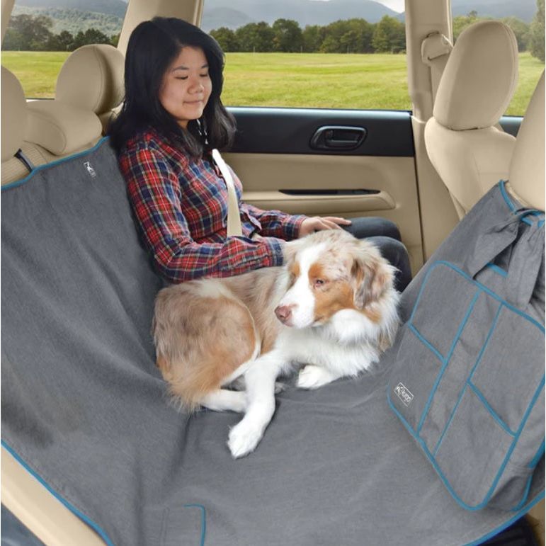 The Heather Hammock offers practicality and style with heathered fabric and secure attachment at 8 points to protect car seats and block pup's access to the front seat. Half can be folded back for human passenger, while accommodating seatbelts and car seats with slots.